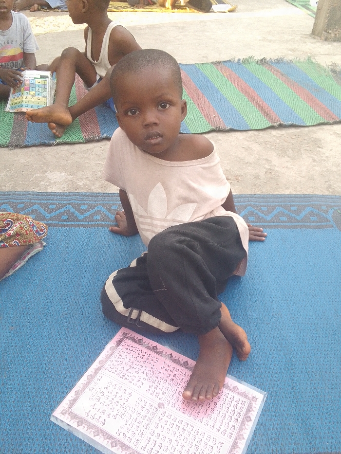 The scene depicts an outdoor gathering of children on a concrete surface in the city of Unknown, Unknown. Multiple woven mats, predominantly blue, are laid out. In the foreground, a young child with dark skin, approximately 3-5 years old, is seated cross-legged on a blue mat. This child wears a light-colored short-sleeved shirt featuring a white Adidas trefoil logo, worn off the left shoulder, and dark trousers with a white vertical stripe on the outer seam of the right leg. The child is barefoot and looks directly towards the camera with a neutral expression. A pink-bordered document displaying rows of script (likely Arabic) rests on the mat beneath the child's right foot. To the left, a second child is partially visible, also seated on a blue mat, holding an open book with alphabet charts displaying Arabic characters. Further in the background, a third child, wearing a white sleeveless top, is partially visible. To the right of the foreground child, a separate striped mat with green, blue, and red bands lies on the concrete. The environment suggests an outdoor, informal educational or gathering space.
