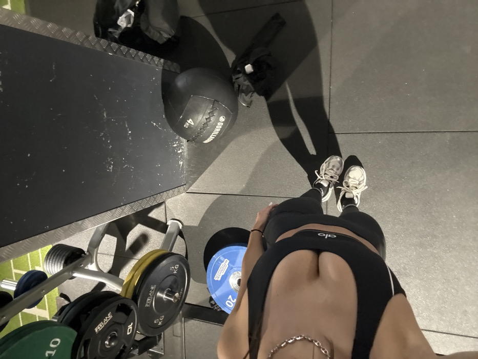 A high-angle photograph captures a scene within a fitness facility in Antibes, France. In the lower-left, a person is visible from the upper torso to the feet, wearing a black sports bra displaying "alo" branding, black leggings, and white athletic shoes, with the right shoelace untied. A silver-colored chain necklace is visible around the neck. To the upper-left, a metal weight rack holds various barbell plates, including black "FIT LANE 10 KG" and "FIT LANE 5 KG" plates, a green plate marked "10", and a blue "TECHNOGYM 20" KG plate. A dark gray/black vertical structural element, textured with what appears to be a diamond plate pattern along its edge, runs down the center-right, showing multiple white scuff marks. On the dark gray rubber mat floor, to the right of the structural element, a black medicine ball labeled "GORILLA GEAR 4 KG" is visible. Adjacent to the medicine ball, a black bag or pile of clothing containing a white object lies on the floor, partially obscured by shadows. Strong artificial lighting casts distinct shadows of the person and objects onto the floor. A green mat with white markings is partially visible in the upper-left background, behind the weight rack.