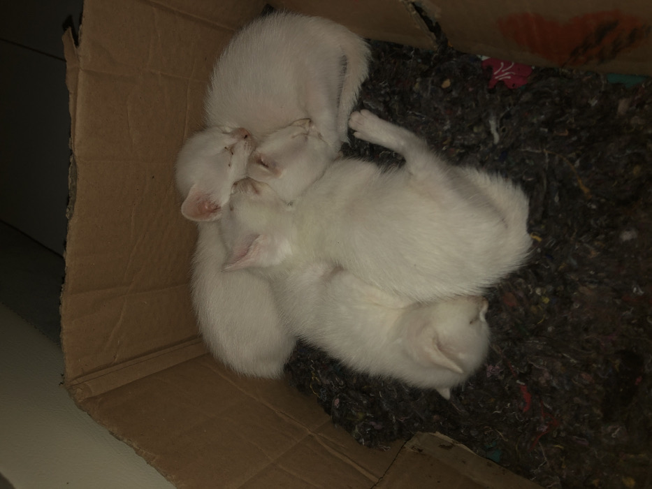 - "Five white kittens are observed sleeping, huddled together, inside a light brown corrugated cardboard box" by FM-aA4dB2, licensed under CC BY 4.0