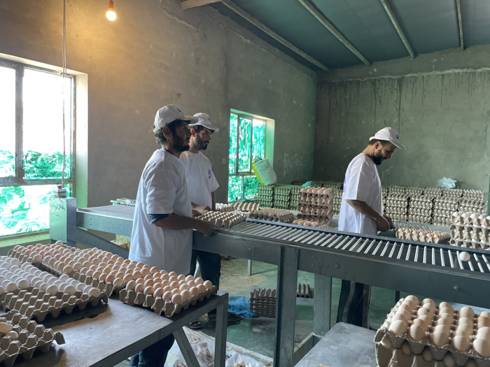 This image depicts an indoor egg processing and packaging facility located in Shuyene Vosta, Afghanistan