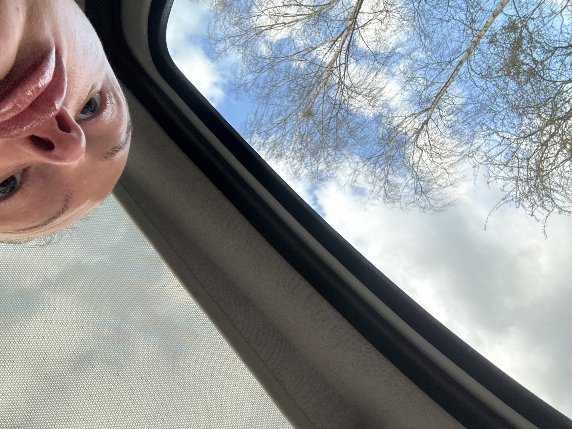 close-up, upward-angled view from inside a vehicle, possibly through a sunroof. The upper left of the frame captures part of a person's face, including the lips, nose, and eyes. The view through the window reveals a sky with scattered clouds and tree branches without leaves. The vehicle's interior framing is visible. The specific location within Tunbridge Wells, United Kingdom, cannot be determined from the image alone.