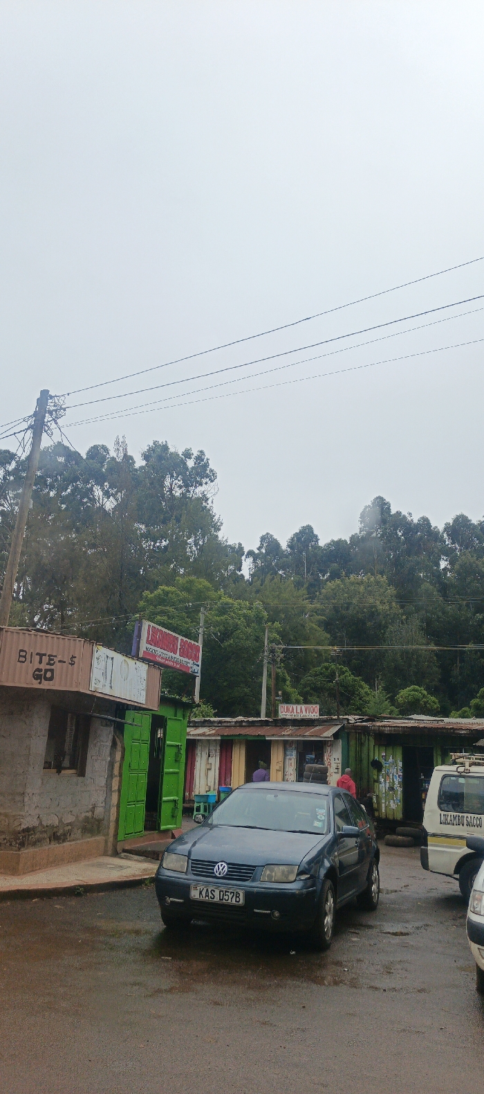 A wet street scene in a rural area is depicted. Small shops, some with signs, line the roadside. The storefronts appear to be made from corrugated metal. A blue Volkswagen sedan is parked in the street. Another white van with "Likambu SACCO" printed is parked behind. Trees and electrical wires fill the background. The sky is overcast.