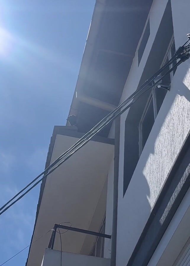 The camera angle is looking up at a two-story building against a clear blue sky with the sun shining brightly. Electrical wires stretch across the frame in the foreground. The building is painted white with a grey trim around the windows and edges. There is a small balcony on the left side of the building. A voice can be heard in the background.