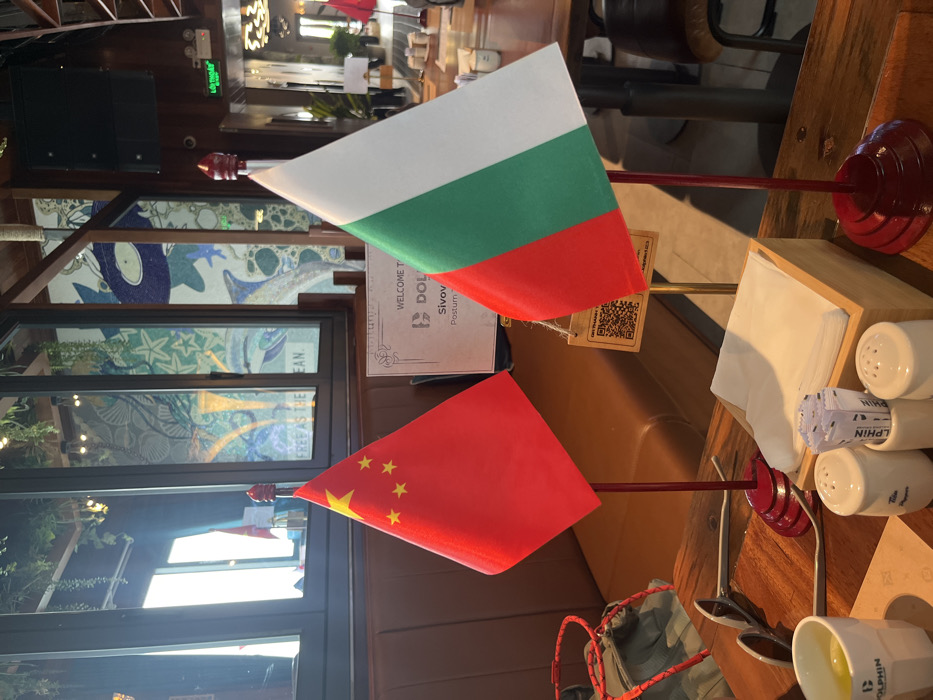The image displays an indoor scene within the Dolphin Restaurant & Bar, located in Bai Chay Ward, Hạ Long City, Quảng Ninh, Vietnam. The foreground is dominated by a dark wooden table upon which two national flags stand upright: the flag of the People's Republic of China on the left and the flag of Bulgaria on the right, both mounted on red poles with circular red bases and red finials. To the left of the Chinese flag, a white ceramic cup with a "DOLPHIN" logo contains a yellow liquid. Adjacent to it are a pair of open sunglasses. Between the flags, a rectangular wooden box holds white folded napkins, flanked by two white salt shakers and a small container holding packets, some labeled "DOLPHIN." A red braided cord is partially visible on the far left. In the mid-ground, behind the table, a brown upholstered booth seat runs horizontally. Above the table, a white sign is displayed, reading "WELCOME TO THE DOLPHIN," with additional text "Sivov" and "Postum" partially visible below. A small, square tag with a QR code is attached near the base of the Bulgarian flag. The background features large windows extending across the left and center, allowing bright daylight to illuminate the scene and reflecting elements of the interior. Hanging green foliage is visible above the windows. A sign stating "FREE AS THE OCEAN" is affixed to one of the windowpanes. To the right, decorative wall panels feature blue, green, and white mosaic-style patterns depicting marine life such as fish, dolphins, and starfish. Further into the background, the restaurant space extends, revealing additional tables, chairs, and overhead lighting fixtures, with blurred figures indistinctly present in the distance.