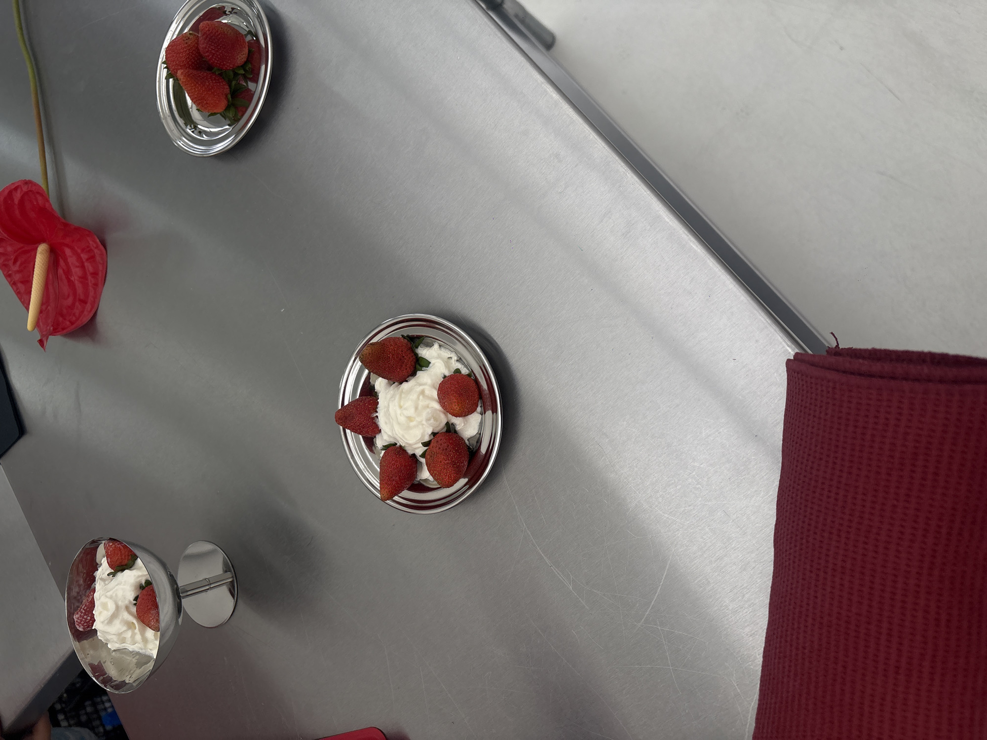 The scene presents a collection of silver dishes and a silver serving cup containing strawberries and whipped cream, arranged on a brushed stainless steel surface. A red anthurium flower is positioned near one of the dishes. A red waffle-textured cloth is placed on the right side of the frame. The location is not discernible from the image.