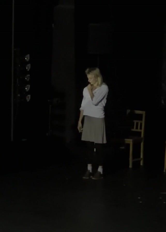 A woman with blond hair, wearing a white shirt and gray skirt, stands alone in a dark room under a spotlight. Her hands are near her face, and she appears to be speaking or signing. To her left, there is a lighting rig with four lights. To her right, there are two wooden chairs. The floor is dark and reflective. The background is entirely black.