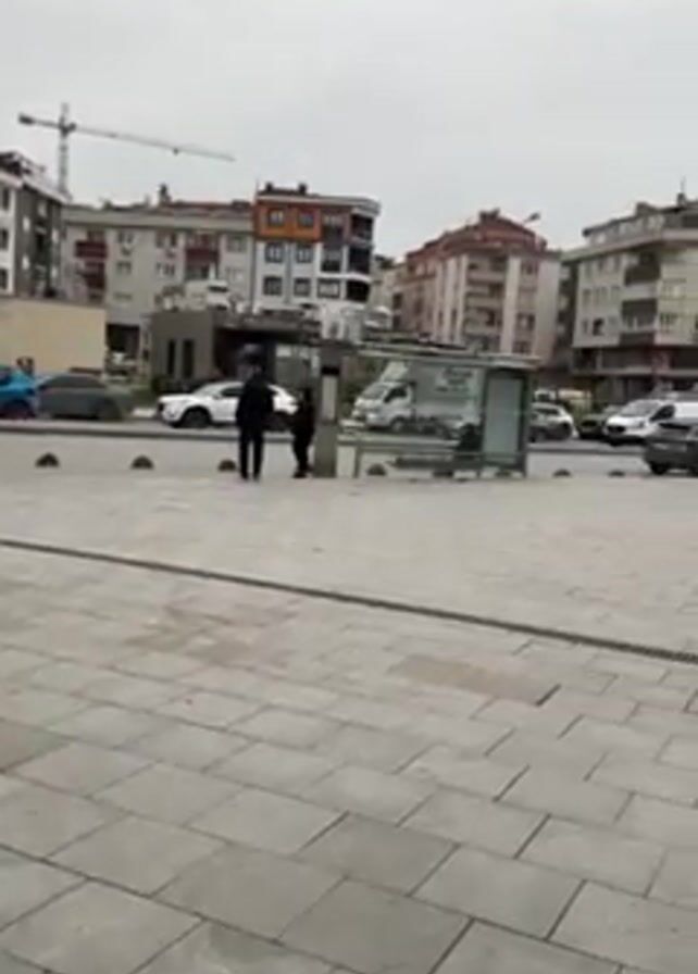 n urban scene on an overcast day. The ground is covered with a pattern of large, gray paving stones. There are several multi-story buildings of varying architectural styles in the background. Cars and buses are visible on the street bordering the paved area. A construction crane can be seen in the distance. A bus stop shelter is present along with a few people in dark clothing, one of whom walks away from the bus stop, heading into the paved area. The camera pans slightly to follow the person walking.