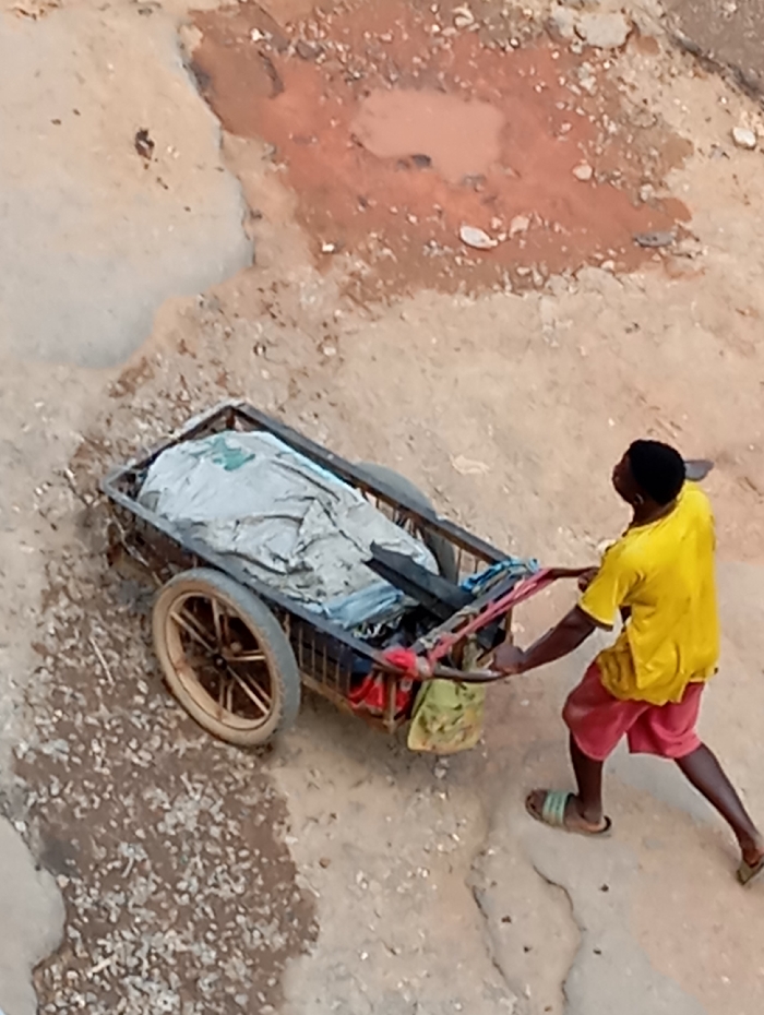 The scene, set in Fegge, Nigeria, shows a single male individual pushing a two-wheeled utility cart along an unpaved dirt path