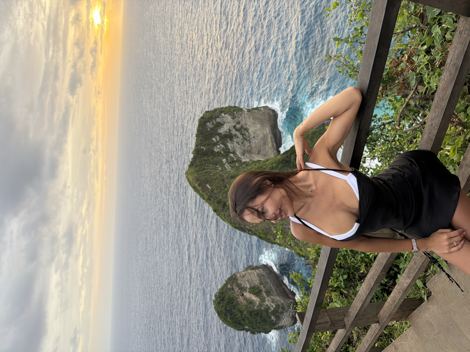 The image displays a female subject at the Kelingking Beach viewpoint, located in Bunga Mekar, Nusa Penida, Indonesia