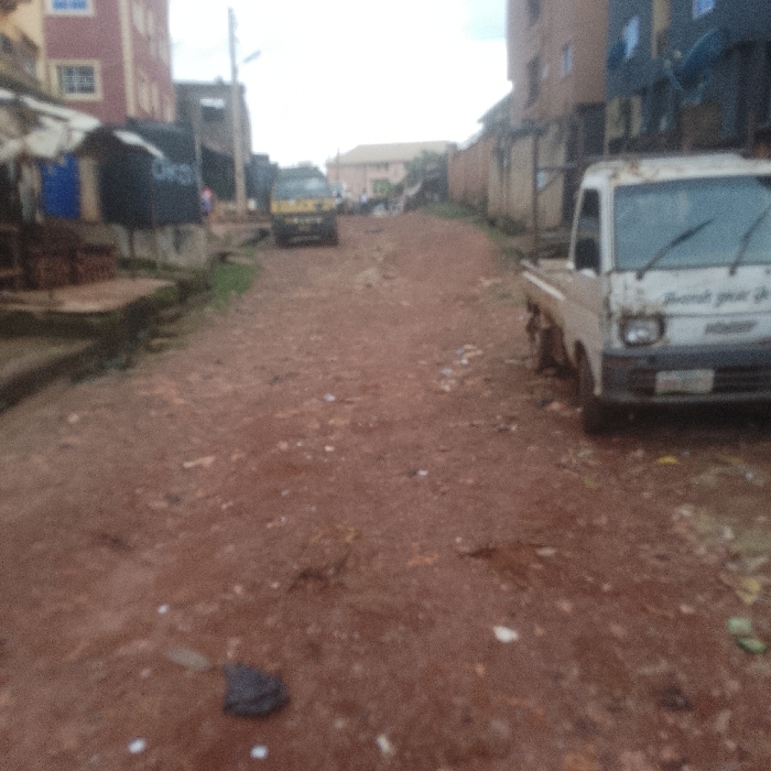 The image displays an unpaved, reddish-brown dirt road in an unknown city, Unknown