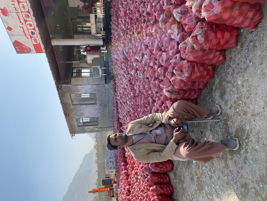 - "A man sits on a low stool in the foreground, facing right, against a vast expanse of bagged produce in Sard-E 'olya, Afghanistan" by FM-B5wmg2, licensed under CC BY 4.0