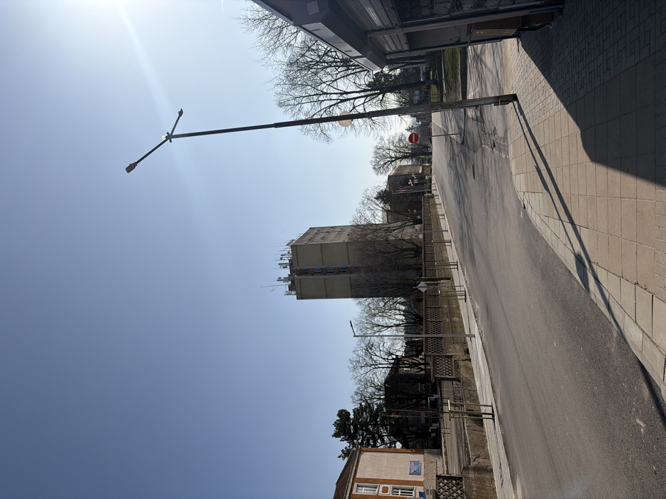This image depicts a street scene in Cherven Bryag, Bulgaria, with the prominent Municipal Administration Building (Община Червен бряг) in the background. The scene is illuminated by bright daylight under a clear blue sky, casting long shadows from right to left, indicative of morning or late afternoon. In the immediate foreground on the right, a light-colored paved sidewalk with square concrete tiles is visible, partially in shadow. A dark, lean street light pole stands at an angle, extending its shadow across the sidewalk and part of the asphalt road. To the far right, the edge of a building or kiosk with a textured stone facade and a closed, rolled-down metal shutter is present. The central foreground features an asphalt road, free of vehicles, extending into the distance and appearing to curve slightly rightward. Along the left side of the road, a raised sidewalk is bordered by a low, decorative concrete wall. A row of young deciduous trees (saplings) with protective wooden stakes and cages lines this sidewalk. Further down this left sidewalk, another street light pole is visible. In the midground, a red circular 'No Entry' sign (white horizontal bar) is mounted on a pole to the right of the road. Bare deciduous trees with slender branches line both sides of the street, suggesting late winter or early spring. On the left, a multi-story building with a light-colored facade is partially obscured by trees, alongside a mature evergreen tree. The background is dominated by the multi-story (approximately 8-10 stories) Municipal Administration Building, characterized by its light beige or tan facade and numerous vertical window rows. The rooftop is extensively equipped with various communication antennas, masts, and satellite dishes. The clear blue sky exhibits a strong sun flare in the upper right quadrant. No pedestrian or vehicular traffic is observed in the scene.