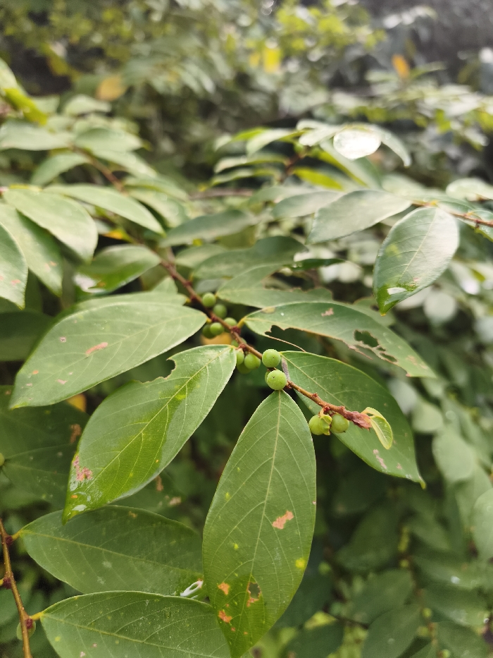 Lush green leaves fill the frame, some showing signs of insect damage with holes. Small, round, green berries sprout along reddish-brown stems, adding a touch of color contrast. Light plays on the leaves, highlighting their smooth surfaces. A slight blur in the background suggests a wider landscape of similar foliage. Rust-colored spots are visible on some leaves.