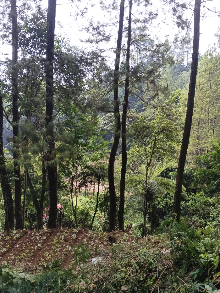 The scene depicts a dense forested area within Na Sangkham, Laos. The foreground features a sloped expanse of tilled brown earth with nascent green sprouts arranged in rows, adjoined by unruly green undergrowth containing scattered white debris. Multiple tall, slender trees with dark, rough bark, consistent with conifers, rise vertically through the midground. Between these trunks, layers of smaller trees, dense green foliage, and large ferns are visible, including a prominent tree fern slightly right of center. A section of reddish-brown exposed earth and sparse pink flora are discernible deeper within the foliage. The background shows a continuous, thick forest canopy covering distant hilly terrain, beneath a light gray, overcast sky. No persons are depicted.