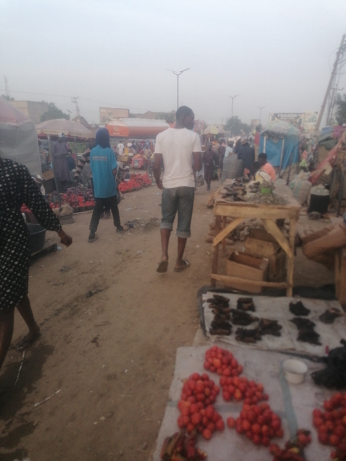 A bustling marketplace scene features vendors and shoppers amidst a hazy atmosphere. Heaps of tomatoes and dried goods are prominently displayed on tables. Pedestrians navigate the crowded space, including a man in a white shirt and denim shorts walking away from the viewer. The scene suggests a lively trading environment, likely located in an urban or suburban setting.