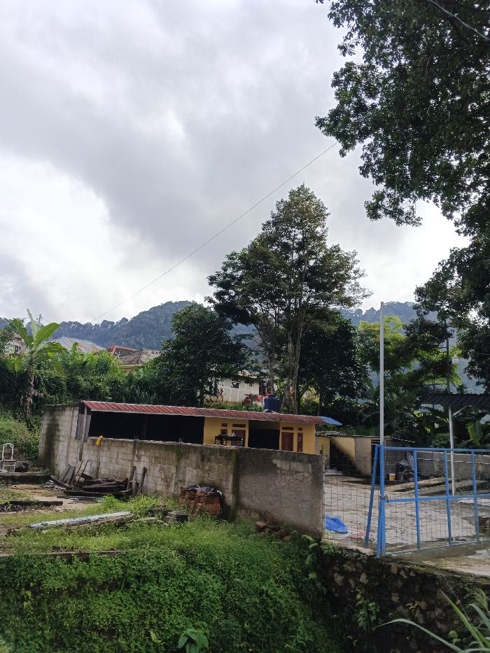 A low-angle shot reveals a yellow building with a red roof behind a gray concrete wall, partially obscured by lush green vegetation. A mountain range rises in the background under a cloudy sky, interspersed with trees. A blue fence encloses a paved area, and a large tree stands to the right, partially framing the scene. A power line stretches across the sky.