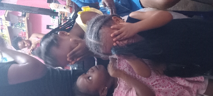 Four young children gather in an indoor setting near shelves lined with products. One child in a yellow shirt hides their face with their hands, while another, dressed in a black shirt, also covers their face. A third child in a pink, patterned outfit looks up. Part of a fourth child's face is visible in the background with a woman standing behind them. The setting appears to be a small shop or store, with various items displayed on the shelves behind them.