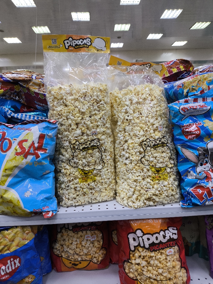 A shelf displays a variety of snack items. Two large, transparent bags prominently feature "Pipocas Saladitas" filled with popcorn. To the left, a blue "Po Sal" bag is partially visible, and to the right, a blue bag with a cartoon rabbit. Below, "Radix" snacks are on the left, while "Pipocas Picantes" bags with red packaging are visible towards the right. The snacks are neatly arranged. The lighting in the store is bright.