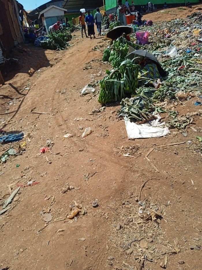 A dirt road cuts through a bustling outdoor market. Bunches of green bananas are piled on the ground, along with discarded banana leaves and other debris. People are walking and sitting amidst the produce. Trash litters the area to the right. Buildings are visible in the background under a bright, sunny sky. The scene depicts a vibrant, though somewhat disorganized, marketplace.