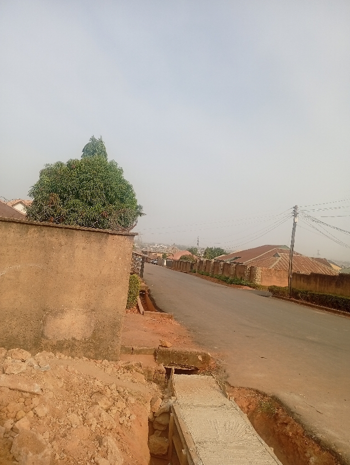 A street scene features a paved road receding into the distance, lined with walled properties and foliage. On the left, a partially constructed concrete structure sits amidst an excavation site with exposed soil. Overhead, a hazy sky veils the scene. An overgrown tree tops a wall, and power lines stretch across the sky on the right side of the road. The setting evokes a suburban or rural neighborhood.