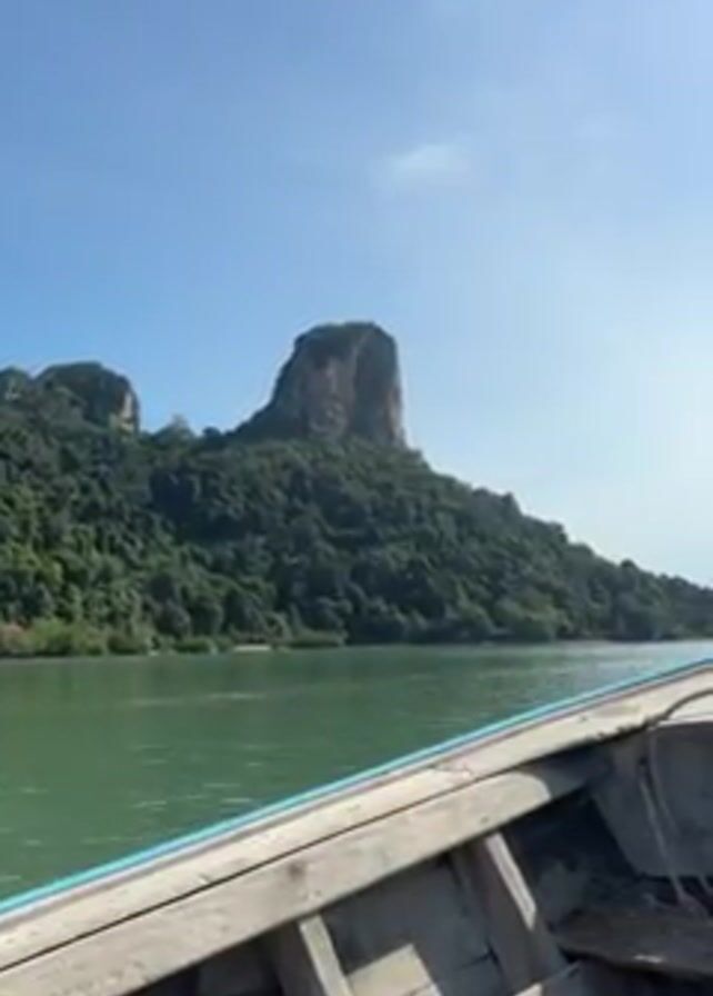 boat ride on calm water with a view of islands. The camera is positioned at the front of a wooden boat, looking out towards a large, rocky island covered in lush green vegetation. The sky is clear and blue with a few wispy clouds. The water is a tranquil green color. The boat is moving slowly, giving a steady, serene view of the landscape. The boat itself appears aged, with its wooden planks showing signs of wear. There's a simple decorative element at the front of the boat. The overall impression is peaceful and scenic.