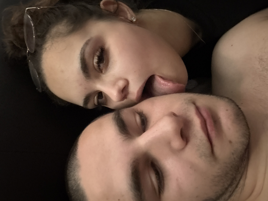 The image displays two individuals in a close-up, dimly lit indoor setting, stated to be in Atiya, Bulgaria. In the foreground, a male with a light complexion, short dark hair, and visible stubble is depicted from the upper chest upwards, bare-chested. His head is angled slightly down and to the right, with his eyes cast downwards. To his right, partially behind him, a female with a light complexion and dark hair, styled upwards with glasses resting on her head, is present. She is wearing a dark garment, a small square earring in her right ear, and a thin necklace chain. Her mouth is open, with her tongue extended and making direct contact with the right side of the male's face, near his temple. Her visible right eye is directed towards the camera. The background is uniformly dark, offering no further environmental details.