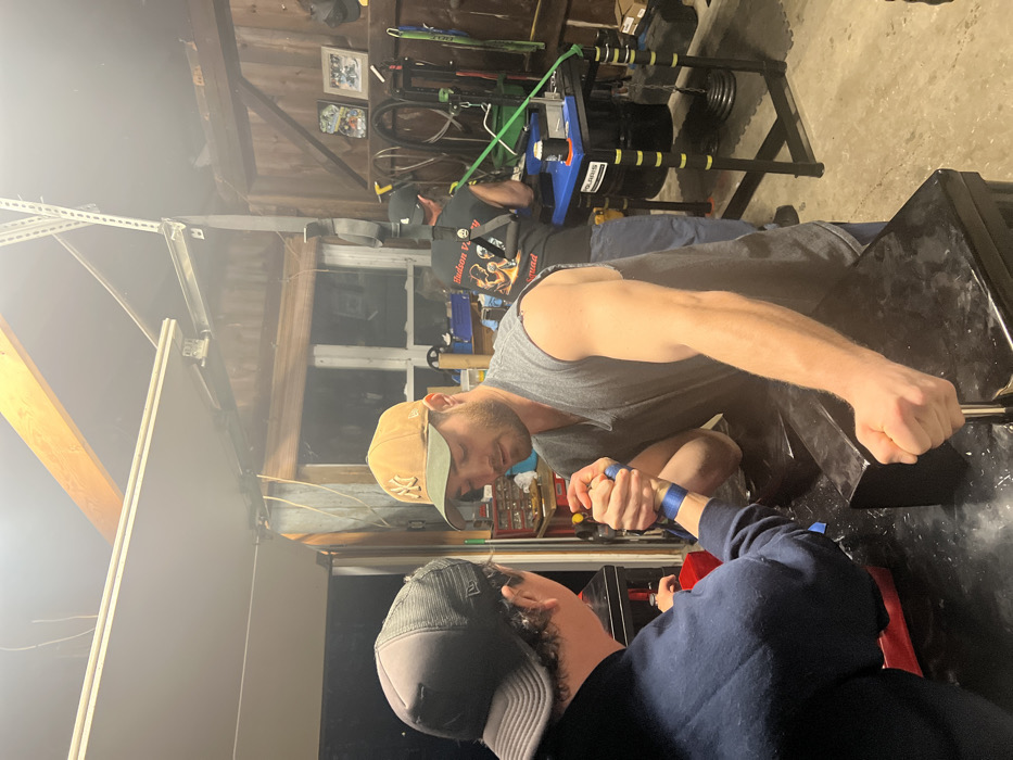 The image depicts an indoor arm wrestling training session or match occurring within a garage in the City of Newburgh, United States of America