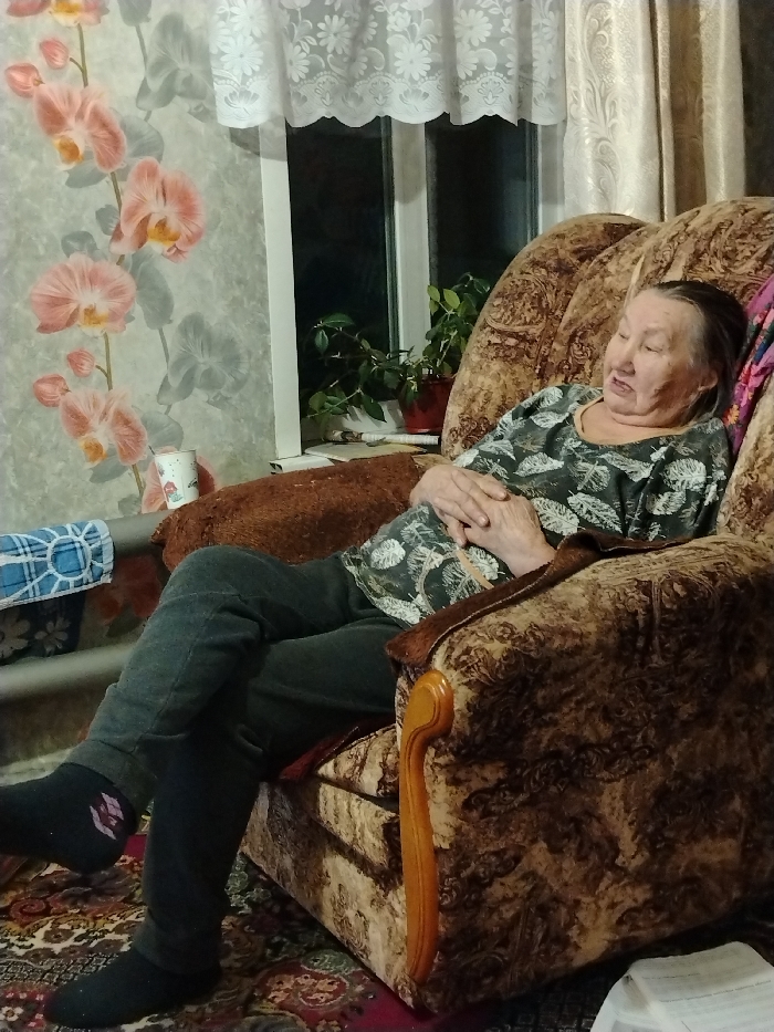 An elderly individual is observed seated and reclined in a brown and gold patterned upholstered armchair within an indoor setting in the city of Дойная, Russia