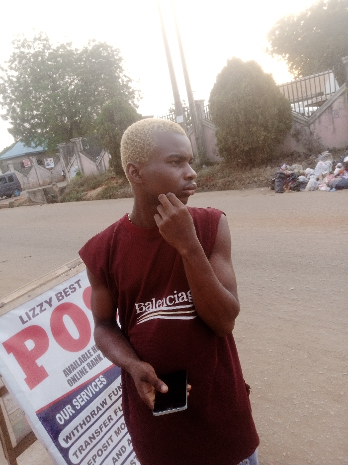 A young male with dark skin and bleached blonde hair stands centrally in a street scene in Nsugbe, Nigeria