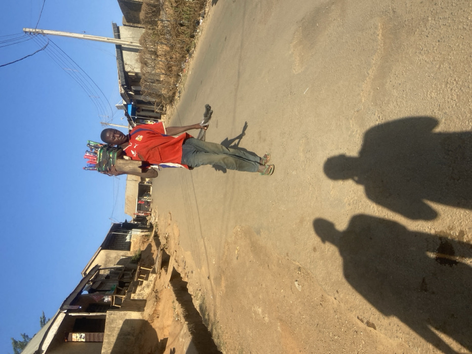 An African man stands on a sunlit road. He wears a red shirt and jeans, balancing a bundle of goods on his shoulder. Buildings and a utility pole are visible in the background. Two distinct shadows are cast on the road, suggesting two observers. The overall scene conveys a sense of everyday life in a developing area, with street vending as a visible means of livelihood.