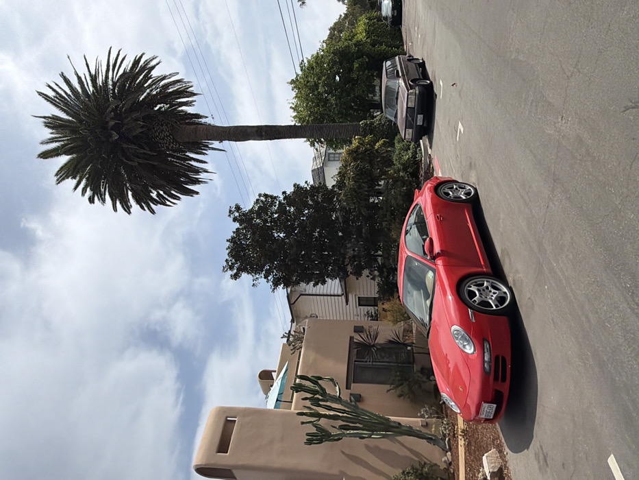 This image captures a residential street scene in Manhattan Beach, United States of America, under a partly cloudy sky. In the foreground, a red Porsche 911 Carrera (997 generation) with California license plate 8RFG589 is parked on the asphalt street, oriented towards the right. It features silver multi-spoke wheels and a visible tan interior. Adjacent to the Porsche on the left is a multi-story building constructed with light beige stucco, featuring a distinctive rounded parapet or chimney-like structure on its roofline and multiple columnar cacti growing vertically near its base. The address "2810" is visible by its entrance. Further down the street on the right, a dark brown or maroon older model Volvo wagon (likely 240 series) is parked. A very tall palm tree with a thick, textured trunk and a dense crown of fronds stands prominently on the right side of the frame, extending high into the sky. A white residential building is partially visible behind the Porsche and to the right of the stucco structure. Overhead utility lines are present across the upper mid-ground. No people or animals are visible in the scene.