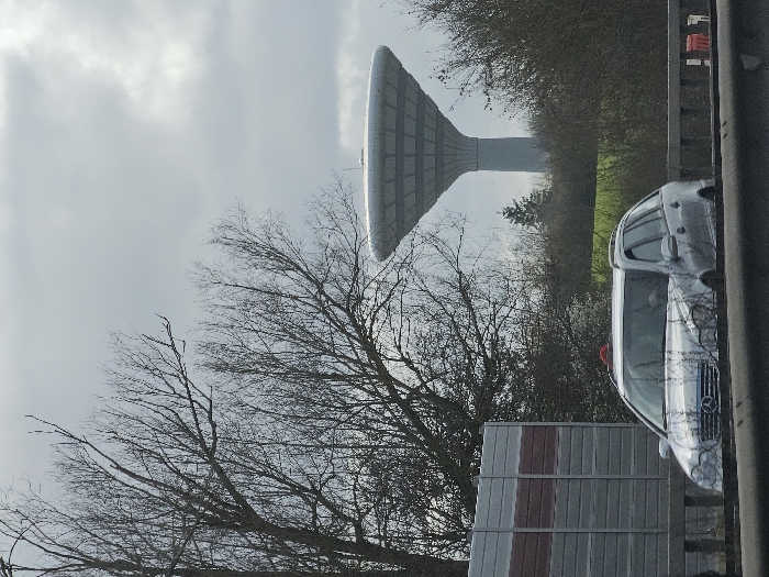 The image depicts an outdoor scene in Foetz, Luxembourg, under an overcast sky. In the foreground, a dark, blurred horizontal element occupies the bottom, above which is a grey concrete barrier with dark vertical supports. Moving into the midground, a silver Mercedes-Benz C-Class Estate (W203 generation) travels leftward, partially obscured by the foreground barrier. A red object is affixed to the vehicle's roof, and a driver is partially visible inside. To the left of the road, a grey sound barrier with a reddish-brown horizontal stripe is present. Behind the road and sound barrier, a strip of green grass is visible, bordered by numerous bare deciduous trees and some evergreen bushes. The background is dominated by the prominent, light grey water tower of Foetz, characterized by its tall, slender central column supporting a wide, disc-shaped reservoir with a ribbed underside. Additional bare trees and evergreen foliage frame the water tower. The sky is uniformly overcast with light grey clouds. No other individuals or significant actions are observable.