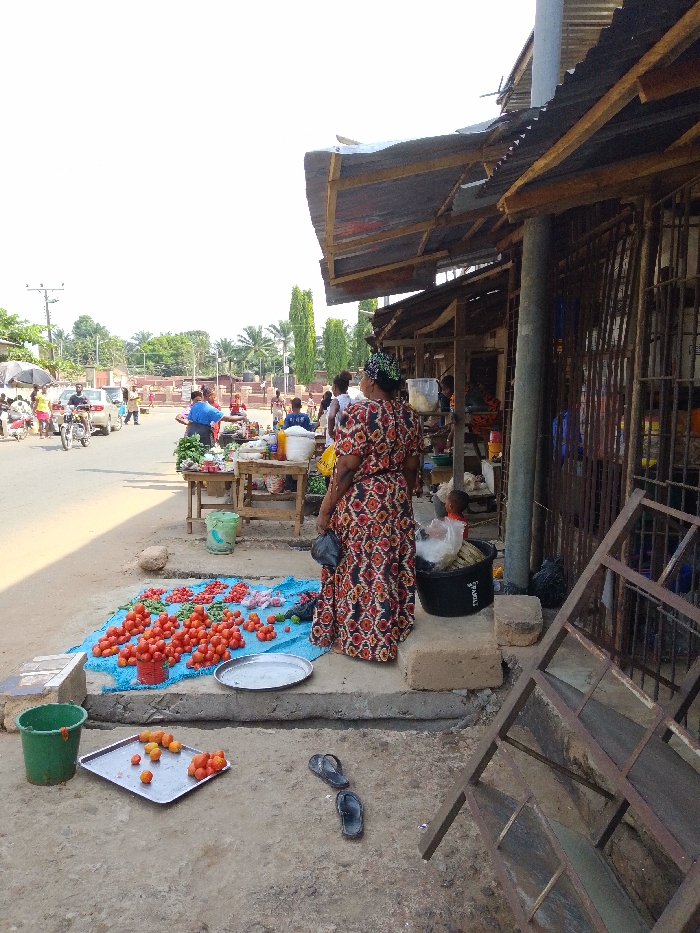 A street market scene unfolds with a woman in a patterned dress standing near a display of tomatoes laid out on a blue tarp