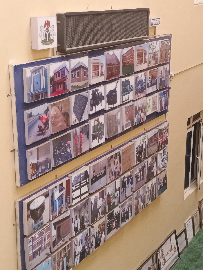 The image displays a large, multi-panel photographic exhibit mounted on a light beige wall, located within the National Building Road Research Institute (NBRRI) in Abuja, Nigeria