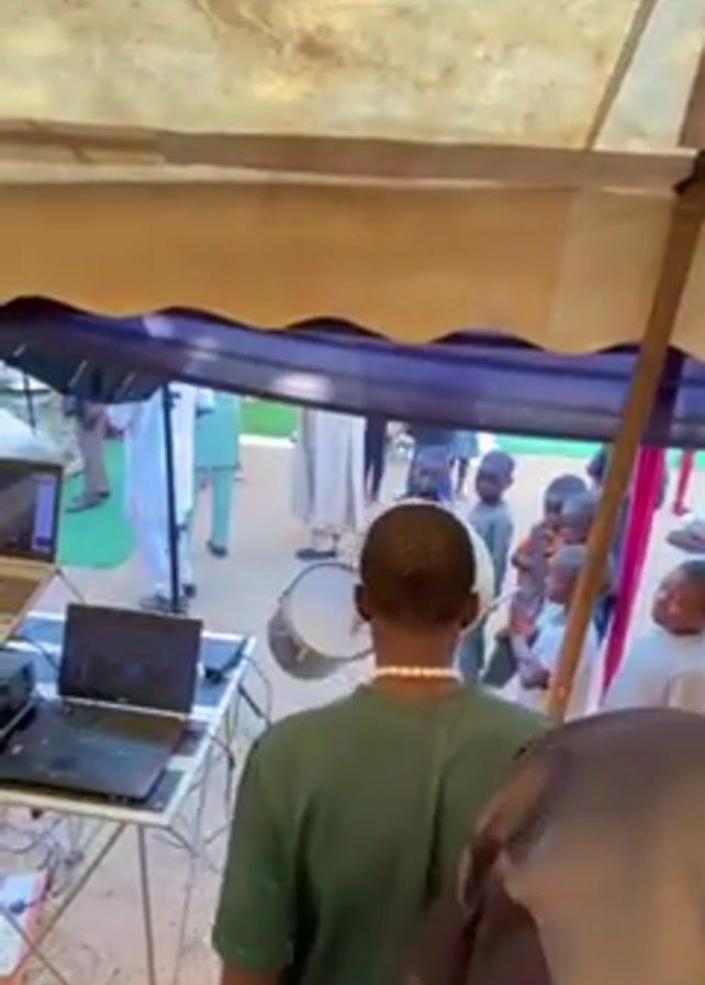 A man in a green shirt and white beaded necklace plays a drum set under a tent while a group of children watch. A laptop is on a stand next to the drums. There are several adults in the background, some wearing white or light-colored clothing. The ground is dirt.
