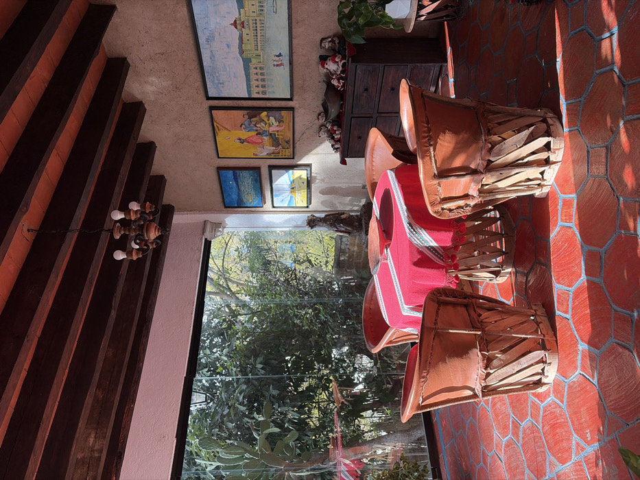 An interior view shows framed artworks on a wall, including landscape paintings. Below, a chest of drawers is adorned with decorative items, possibly Santa figures. A table covered with a red cloth and chairs are centrally positioned, suggesting a dining or gathering area. Large windows offer a glimpse of lush greenery outside. The room has a terracotta-tiled floor and a ceiling with wooden beams.