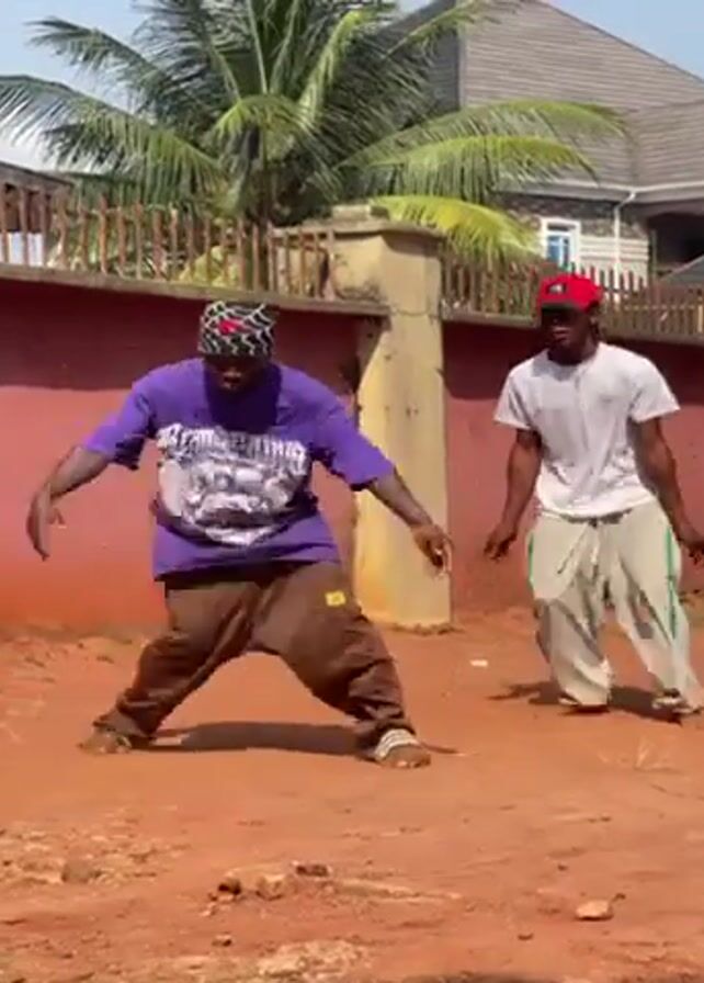 Two men dance on a dirt lot near a red wall and tropical plants. The man in the foreground wears a purple t-shirt, brown baggy pants, and a patterned head covering. The other man, wearing a white shirt, light grey sweatpants with green stripes, and a red baseball cap, dances behind him. The man in the front leans forward and pumps his arms while stepping his feet, while the man behind him makes smaller, more understated movements.