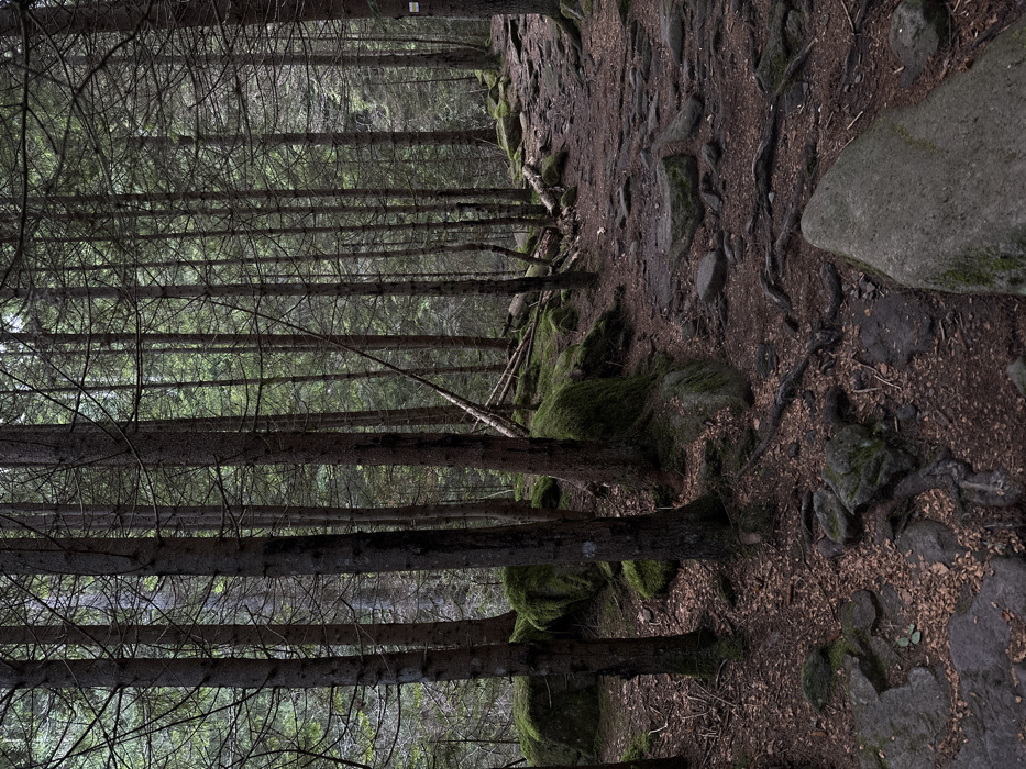This scene depicts a dense conifer forest located near Smolyan, Bulgaria. A winding dirt path, embedded with exposed tree roots and scattered brown leaves, traverses the lower right portion of the frame and extends into the background. Tall, slender conifer trees with dark, straight trunks densely populate the area, their green needles forming a continuous, verdant canopy overhead and a consistent backdrop. The forest floor is uneven, featuring numerous large, irregularly shaped boulders predominantly covered in vibrant green moss. Several fallen tree trunks and branches are interspersed among the rocks and ground cover. A small, square white trail marker is affixed to a tree trunk on the right side of the path in the mid-ground. The lighting is diffused, indicating an overcast sky. No human subjects or animals are present.