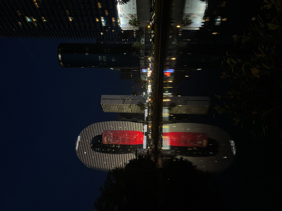The image depicts an urban night scene in Batumi, Georgia, viewed across a dark body of water, likely Batumi Lake. The sky is dark blue-black. In the midground, a prominent, curvilinear white building, identified by a "COURTYARD" sign at its apex, features a large central void. Within this void, a tall, cylindrical structure with a textured, red-illuminated facade is visible. To the immediate right of the Courtyard building stands a lighter-colored, multi-story structure. Further right, a dark, cylindrical building with a glass facade is present. On the far right, a tall, multi-story building with numerous illuminated windows displays a grid-like pattern. A large billboard, partially visible on the right, advertises "DEMI CITY MALL." Along the water's edge in the mid-ground, a roadway is visible with blurred vehicle lights, streetlights, and traffic signals. Palm trees are discernible along the street. The foreground consists of dark, still water, reflecting the illuminated structures and lights from the city, particularly the red cylindrical building and the distinctive shape of the Courtyard building. Dark foliage is present along the bottom edge, primarily on the left and right. No individuals are clearly discernible.