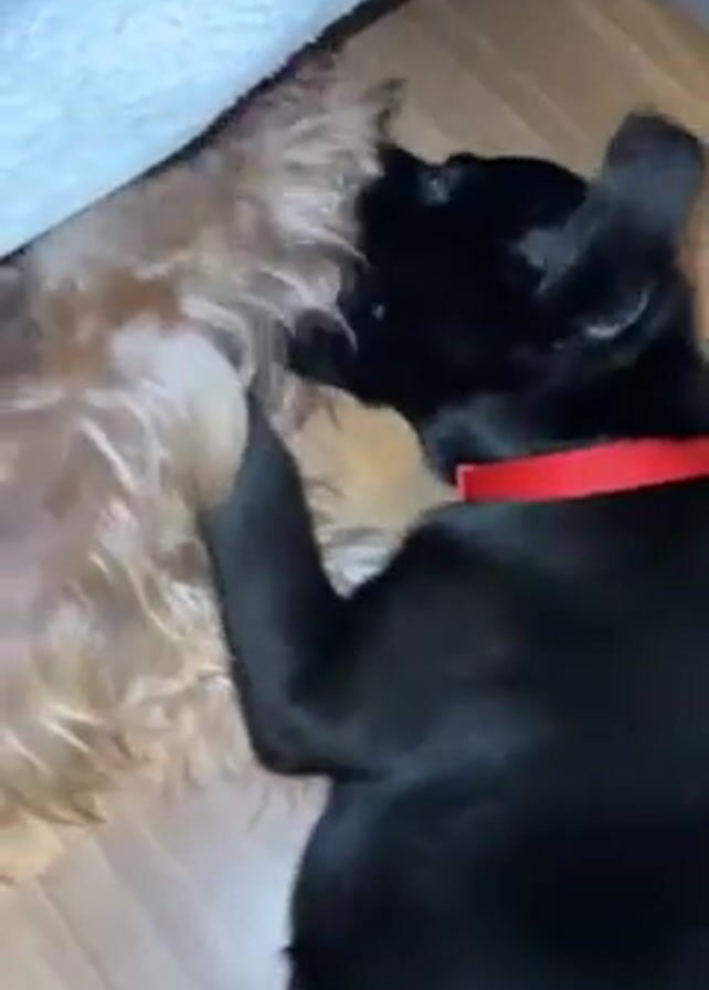 Two dogs, one black and one light brown, are lying together on a wooden floor. The black dog is on its side, facing the light brown dog. The light brown dog is nestled against a white blanket. The black dog has a red collar. The dogs are interacting closely, possibly playing or cuddling. The scene is dimly lit.