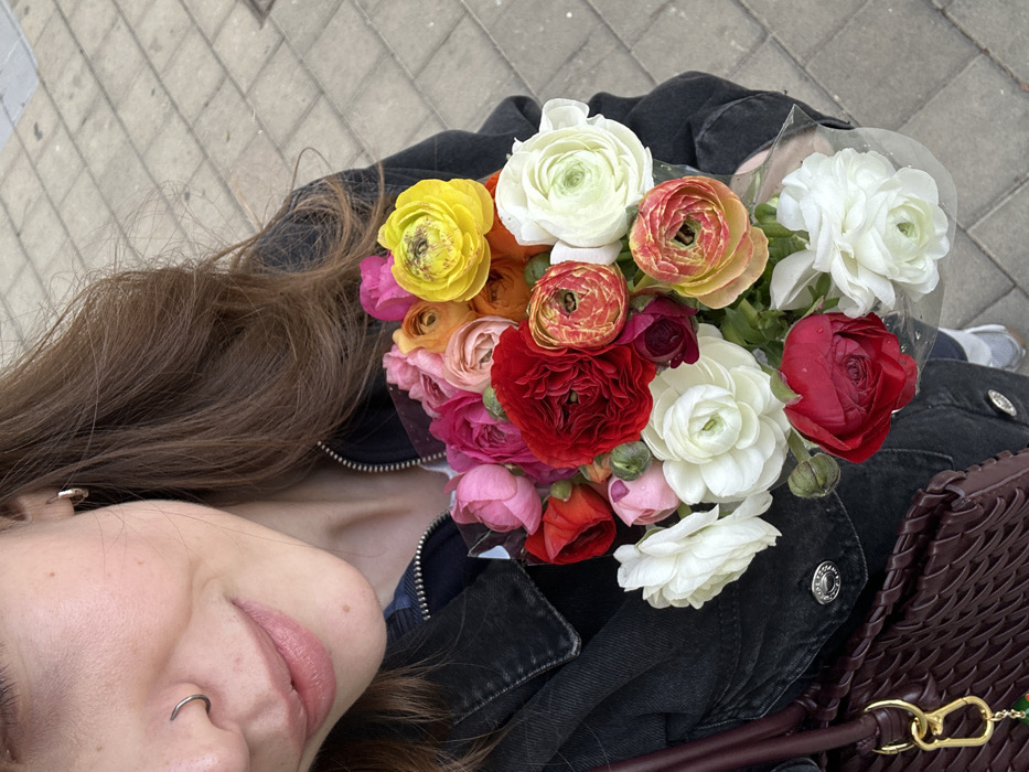 A female subject is partially visible from the mid-torso upward in an outdoor urban setting in Tel-Aviv, Israel. Her face is shown from the nose down, featuring a nose ring in her left nostril and a slight smile. She has long brown hair and wears a dark denim jacket with a zippered closure over a lighter inner garment. A small silver hoop earring is present in her right ear. She holds a colorful bouquet of ranunculus flowers, primarily in shades of red, white, yellow, orange, and pink, wrapped in clear plastic, prominently displayed in the center of the frame. A dark maroon woven bag, adorned with a gold carabiner-style clasp and a small green charm, hangs on her left arm. The background consists of a light-colored, square-tiled pedestrian surface.
