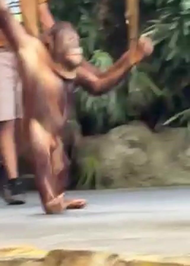 A young orangutan performs a demonstration in an outdoor area with stone and foliage as a backdrop. The orangutan has reddish-brown fur and stands bipedally, raising its arms and legs. The orangutan then sits on a large, cylindrical wood stump, holding something. A person, presumably a trainer, is visible standing behind the orangutan. This person is wearing a tan uniform.