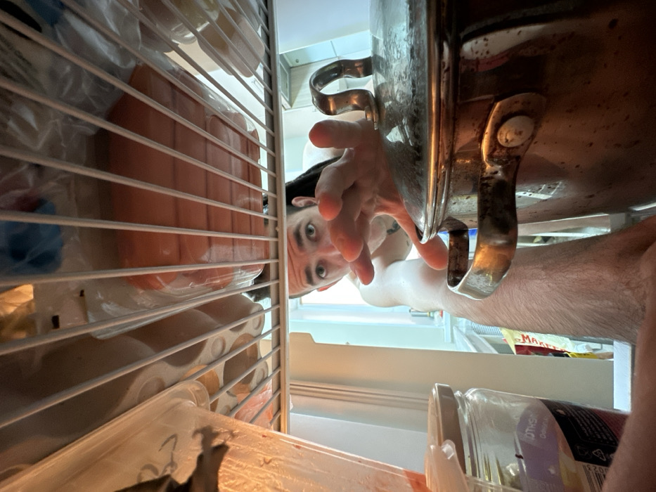 The image depicts a first-person perspective from inside an open refrigerator in a kitchen located in Saratov, Russia. A fair-skinned individual with dark hair, including visible dreadlocks on the right side of their head and a dark tattoo on their left bicep, is partially visible, leaning into the refrigerator. Their eyes are wide and focused towards the camera, and their left arm is extended forward, fingers splayed as if reaching for something. In the immediate foreground, positioned on a lower shelf of the refrigerator, is a large, metallic cooking pot with a domed lid, appearing to be copper or bronze due to its reddish-brown hue and tarnished surface. Above the pot, several metal wire shelves are visible, holding various food containers. One container on the top shelf appears to hold numerous sausage-like items, individually wrapped in plastic. To the left, a glass jar with a brown lid and a clear plastic container with red contents are also present. The interior of the refrigerator is brightly lit. Beyond the individual and through the open refrigerator door, a brightly illuminated domestic kitchen environment is discernible, featuring a window with natural light, suggesting daytime. The background also shows glimpses of white or light-colored kitchen cabinetry. The overall scene captures the act of a person retrieving items from a refrigerator.