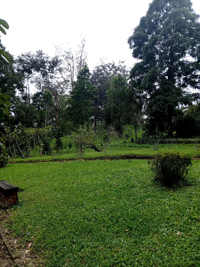 A lush green lawn stretches out, leading to a diverse collection of trees in the background. Some trees are tall and thick, while others are thinner and more sparse. Several smaller plants and bushes dot the landscape. A dark bench sits on the left side of the image and a small, round bush stands on the right. The sky appears overcast, adding a muted light to the scene.