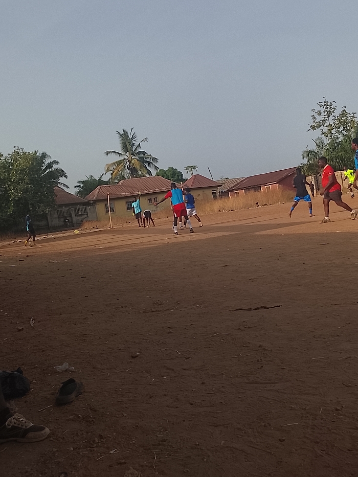 A group of people play soccer on a dirt field. The players are wearing different colored jerseys, including red and blue. In the background are modest, single-story houses with corrugated metal roofs, interspersed with trees, including a palm tree. One person is standing on the side of the field with their shoes and a bag. The sky is overcast.