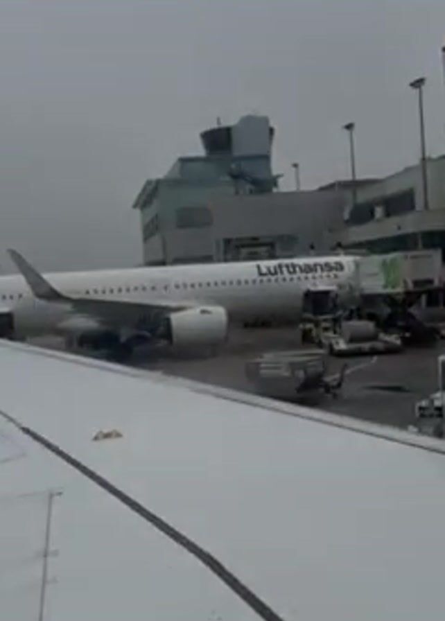From the perspective of an airplane window, the video shows a Lufthansa airplane parked at an airport gate