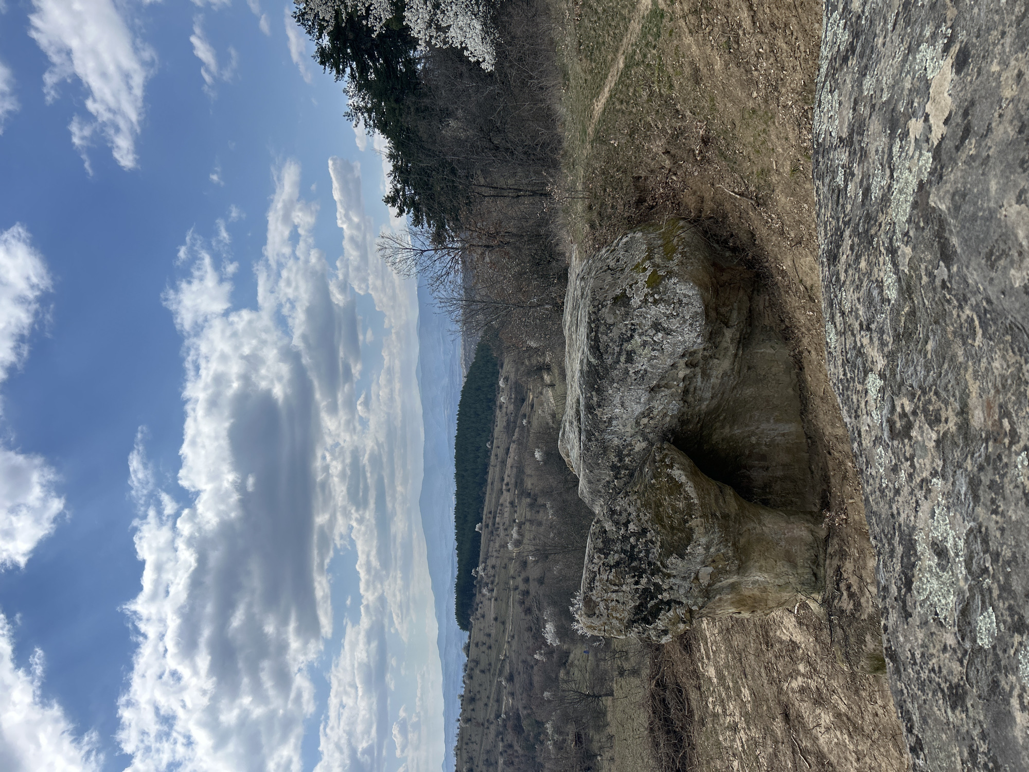The image depicts a rural landscape near Mala Fucha, Bulgaria, under a partially cloudy sky. In the foreground, a prominent, irregularly shaped rock formation with a textured, weathered surface and patches of light-colored lichen occupies the lower-center. A smaller, darker rock with similar lichen coverage is present in the immediate lower foreground. The ground immediately surrounding the main rock is dry, light brown soil with sparse debris. Extending into the midground, a gently sloping hillside covered predominantly with dry, light brown vegetation and scattered deciduous trees is visible. Several of these deciduous trees exhibit white blossoms, indicating early spring. A dense line of dark green conifer trees, likely pines, forms a forest edge along the right side of the frame and across the mid-distance. A narrow dirt path is discernible curving uphill along the right edge, adjacent to the pine trees. In the background, a series of undulating hills and distant mountains, rendered in muted blue and grey tones, stretch across the horizon. The sky, occupying the upper portion of the image, is light blue with numerous white and grey cumulus clouds of varying sizes. No human subjects, animals, or artificial structures are visible within the frame. The scene is static, devoid of observable action or interaction.