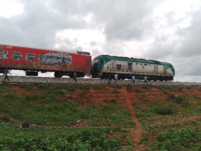 A train is situated on an elevated railway embankment under an overcast sky in Rigasa, Nigeria