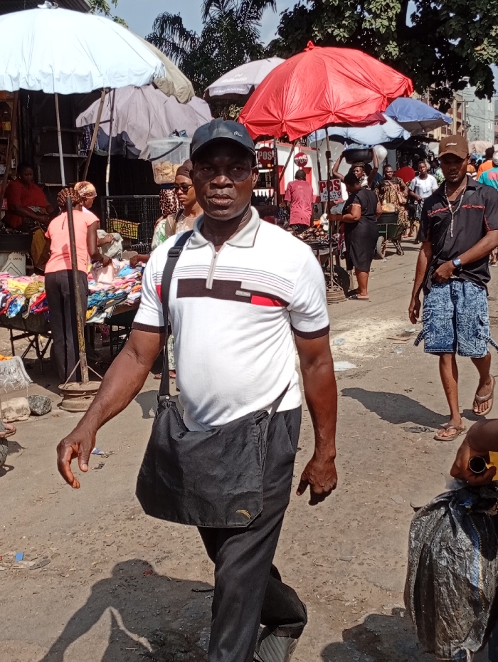 A man in a white polo shirt, black pants, and a baseball cap walks in a bustling outdoor market. He carries a black bag over his shoulder. Various stalls with colorful umbrellas are visible, displaying goods. Other people are walking in the background, some carrying items on their heads or pushing carts. Another man wearing a brown hat and denim shorts is partially visible to the right. The ground appears to be dusty or unpaved.