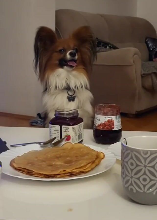 - "small, brown and white Papillon dog sitting near a white coffee table, with a plate of pancakes, two jars of jam, a fork, and a grey mug on the table" by FM-ngoIJ3, licensed under CC BY 4.0